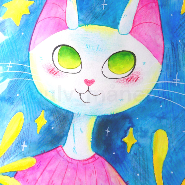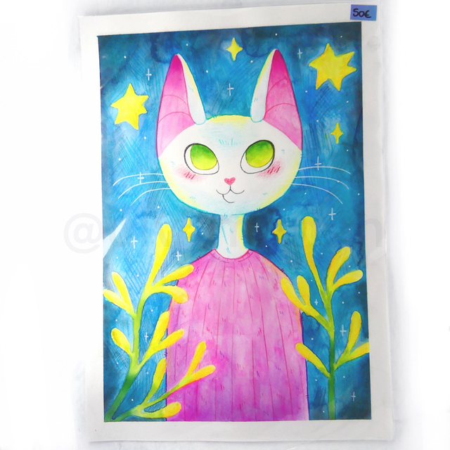 Peinture originale à l’aquarelle chat blanc et rose - papier épais - 21cm x 30cm - vendu avec certificat d’authenticité - photos non contractuelles